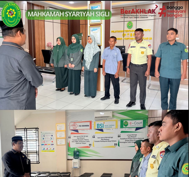Sigli, 15 April 2026 – Panitera Mahkamah Syar’iyah Sigli, Surya Darma, S.H., M.H., memberikan briefing pagi kepada petugas Pelayanan Terpadu Satu Pintu (PTSP) pada Rabu, 15 April 2026 pukul 08.00 WIB, bertempat di ruang PTSP MS Sigli sebelum dimulainya pelayanan.