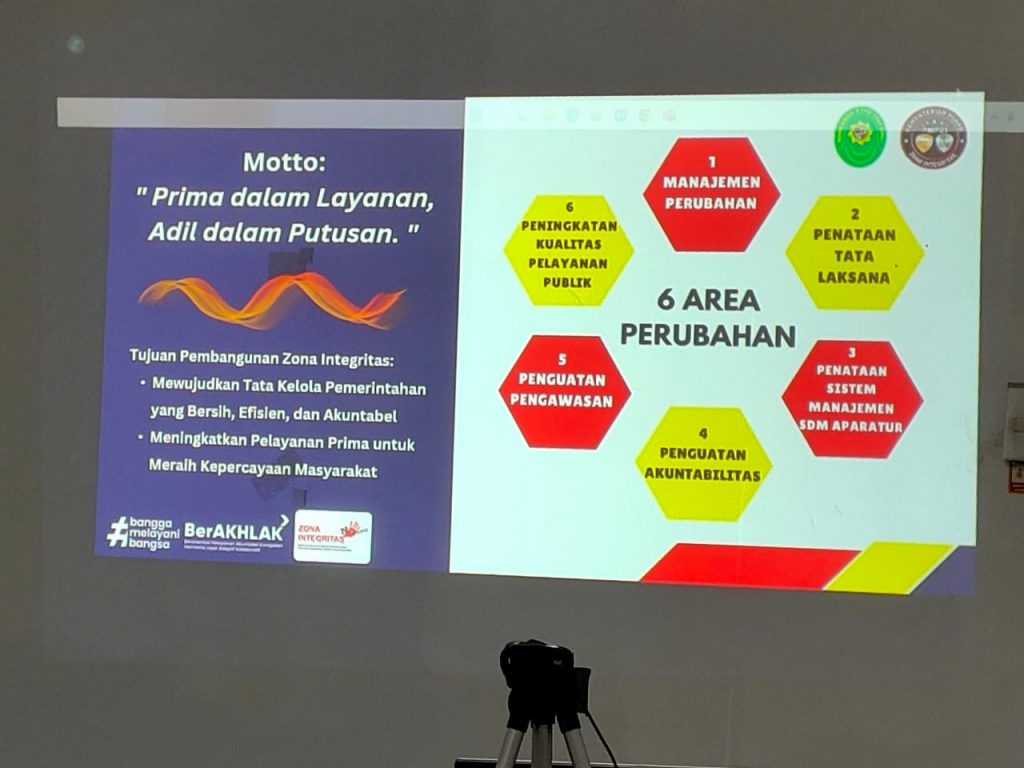 Masing – masing satuan kerja memperlihatkan video profil kantor, dan mempresentasikan progres pada 6 Area Zona Integritas yaitu Manajemen Perubahan, Penataan Tata Laksana, Penataan Sistem Manajemen SDM, Penguatan Akuntabilitas Kinerja, Penguatan Pengawasan, dan Penguatan Kualitas Pelayanan Publik.
