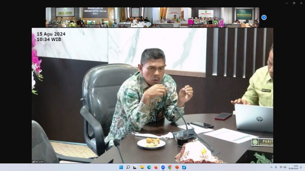 SIGLI – Ketua Mahkamah Syar’iyah Sigli, Ibu Diana Evrina Nasution, S.Ag.,S.H. menyampaikan presentasi pembangunan Zona Integritas Mahkamah Syar’iyah Sigli di hadapan tim pendampingan Mahkamah Syar’iyah Aceh, melalui daring di ruang Media Center Mahkamah Syar’iyah Sigli pada hari Kamis, 15 Agustus 2024.